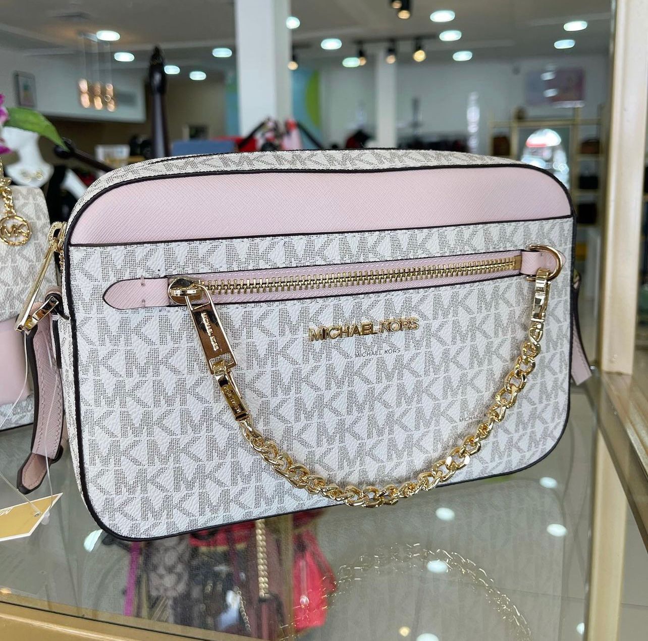 Crossbody MK monograma cadena vainilla/Rosa